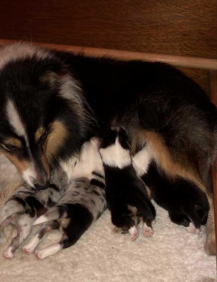 Op 14 juni zijn er bij ons 5 pups geboren, 4 tri reutjes en 1 bleumerle teefje.